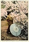 This is an original 1922 color print of a native Japanese woman with traditional kimono and paper umbrella admiring a wild Cherry Blossom Tree. Photography courtesy of Kiyoshi Sakamoto. Please note that there is printing on the reverse.