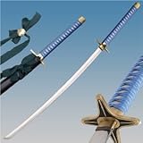 Replicated Toushiro Hitsugaya's Zanpakuto sword from Bleach Anime and it is stunning! Accurate to the anime/manga series with HIGH CARBON STEEL and Sharpen to the fullest, this sword features beautiful fittings and construction. High Carbon steel blade with hardwood scabbard and handle. Tight blue nylon wrapping and custom cloth and metal back strap complete this sword. This Handmade Musashi Hitsugaya Hyourinmaru Zanpakuto Bleach Sword comes FULL TANG with the tsuka being wooden with a ray skin. This sword will make a stunning sword collection.