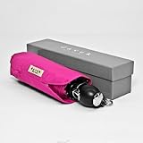 Sized for when you are on the go, the Davek Traveler Umbrella is a compact umbrella which features an extremely convenient, small frame system for easy portability and an automatic-open and automatic-close button system. Utilizing Davek's unique Carbon WindFlex Frame System, this model is both tiny and strong. The fabric is made of high-quality microfiber material with outstanding water repellency. Available in fun colors as well as the classic black, this umbrella is a must for your travels. With its sturdy frame construction and distinctive design, the Davek Traveler Umbrella is the perfect combination of durability and metropolitan style. The canopy is constructed of 190 thread count nylon (the most tightly woven available) to offer maximum protection from precipitation. The gorgeous handle features a convenient clip with strap to attach to your belt or hold in place within a bag. Each Davek umbrella comes with an unconditional Lifetime Guarantee. If, during its lifetime, you find any defect in material or workmanship, or the umbrella should fail to function, Davek will repair or replace it. And, if you lose your umbrella, Davek will replace it for half price. After receiving your package, please register your umbrella with Davek in order to ensure quick and easy service of your Lifetime Guarantee. Color: Fuchsia/Pink. (View all colors for the Davek Traveler Umbrella). Coverage Arc: 40" diameter ("arc-diameter" includes the curve). Closed Length: 9". Opened Height: 23". Useful Tip: For people taller than 6'2" the Davek Duet Umbrella is recommended. Note: All Davek Traveler Umbrellas carried at WhatSheBuys are the version 2.0 which as a stronger, reinforced 7-rib frame system. /* */