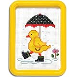 Carrying an umbrella to keep from getting wet, the sweet little duck is playing in a puddle with his boots on. This fun to stitch design appeals to all ages and takes a beginner one step further using 11-count Aida cloth. The enclosed special yellow 5-inch by 7-inch Hoop-Frame is easy to use and comfortable to hold with no screws to tangle threads. And when the stitching is complete the Hoop-Frame is used to immediately frame the design. This counted cross-stitch kit includes 11-count white Aida cloth, cotton floss, needle, chart with picture, good instructions, and the yellow Hoop-Frame.